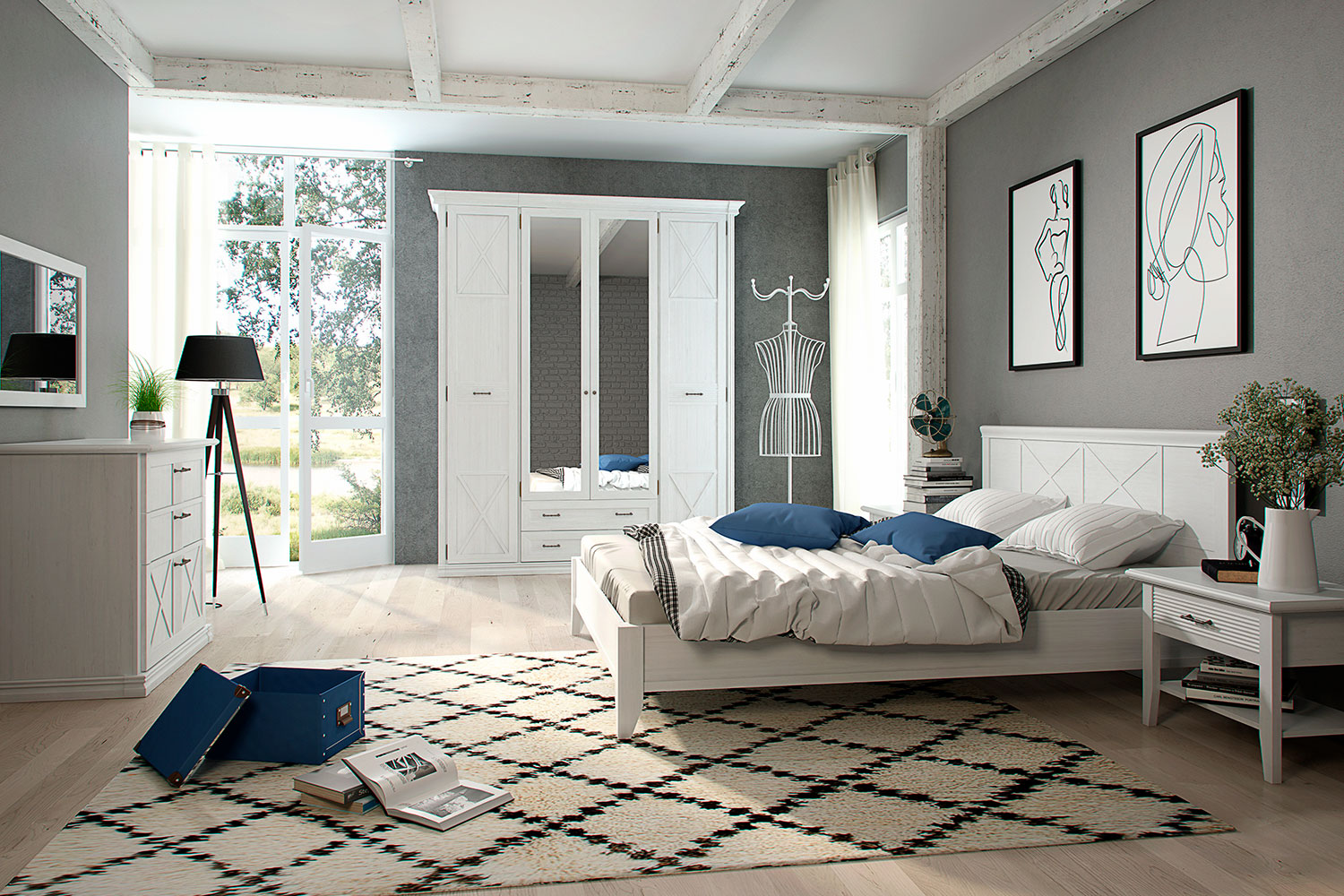К этой мебели подойдут аксессуары в стиле неоклассика, ковры с винтажным потертым рисунком, плетеные пуфы и вязанные пледы. Если вы хотите добавить акцентов в интерьер — используйте стулья и кресла ярких оттенков, для более «спокойного» интерьера — выбирайте приглушенные тона. Не забудьте про туалетный столик, который сделает утренние и вечерние ритуалы еще приятнее.