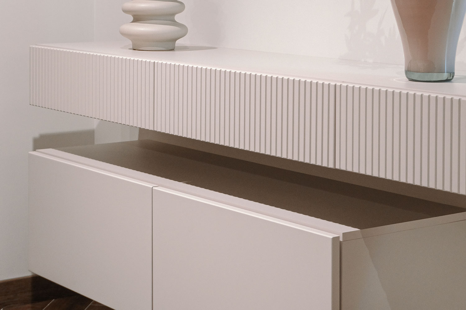 - Внимание! Открывание ящиков происходит путем захвата фасада снизу, поэтому нельзя навешивать вплотную снизу другие модули коллекции Дольче (открывание фасадов будет затруднительным);